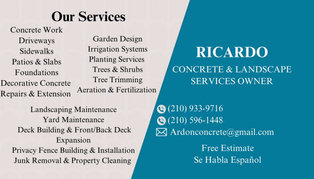 Ardon Concrete & Landscape Services did an outstanding job on our project. From the first call to the final cleanup, their team was professional, punctual, and extremely detail-oriented. The quality of their concrete and landscaping work is truly built to last, and the finished result looks incredible. They communicated clearly, stayed on schedule, and left the property clean. If you’re looking for reliable, affordable, and high-quality work in the San Antonio area, I highly recommend Ardon Concrete & Landscape Services.